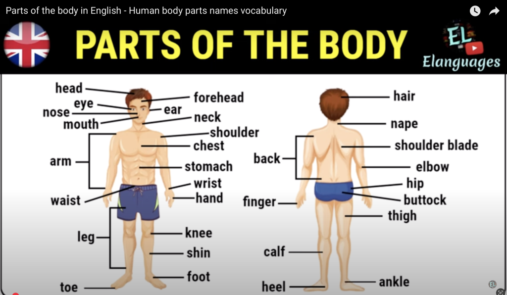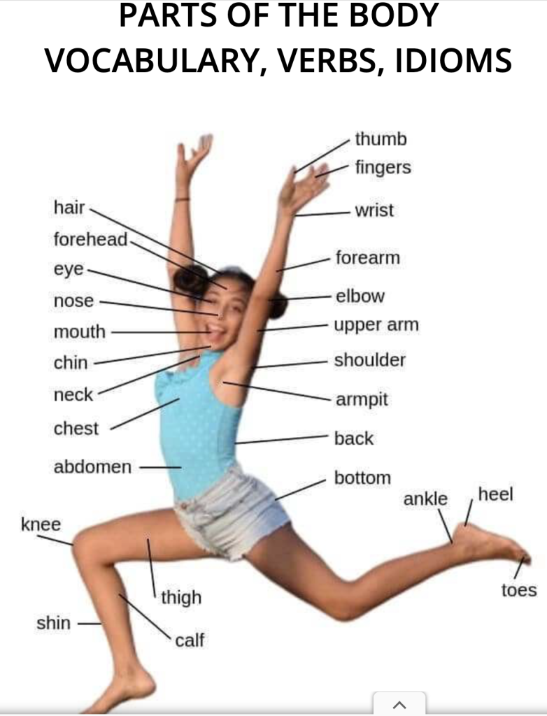 We’ll look at parts of the body vocabulary, verbs, idioms with definitions and examples, including: